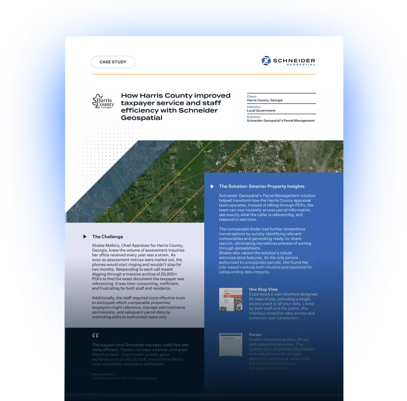 Schneider Geospatial’s Parcel Management solution helped transform how the Harris County appraisal team operates. Instead of sifting through PDFs, the team can now instantly access parcel information, see exactly what the caller is referencing, and respond in real time.